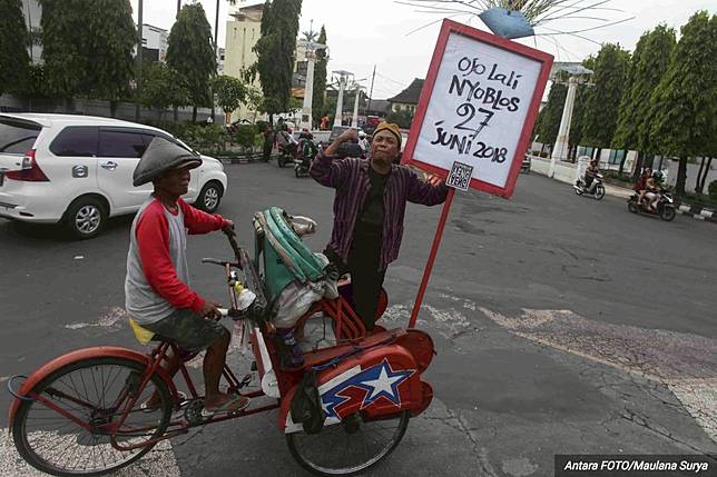 Warga mengusung poster bertuliskan Ojo Lali Nyoblos di Jalan Jendral Sudirman, Solo, Jawa Tengah, Selasa (26/6). Aksi tersebut digelar untuk mengajak warga memakai hak pilih mereka dalam Pemilihan Kepala Daerah (Pilkada) serentak pada Rabu (27/6).